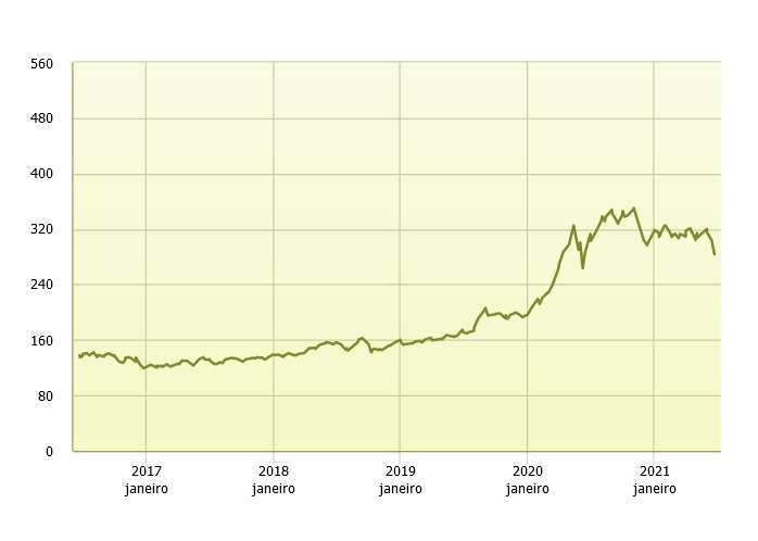 Gráfico com o histórico de varição de valor do ouro em reais por grama nos últimos anos.